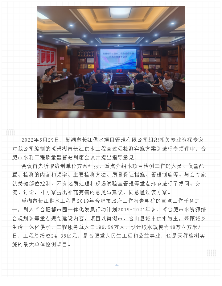 《巢湖市長江供水工程全過程檢測實(shí)施方案》 順利通過專家評(píng)審